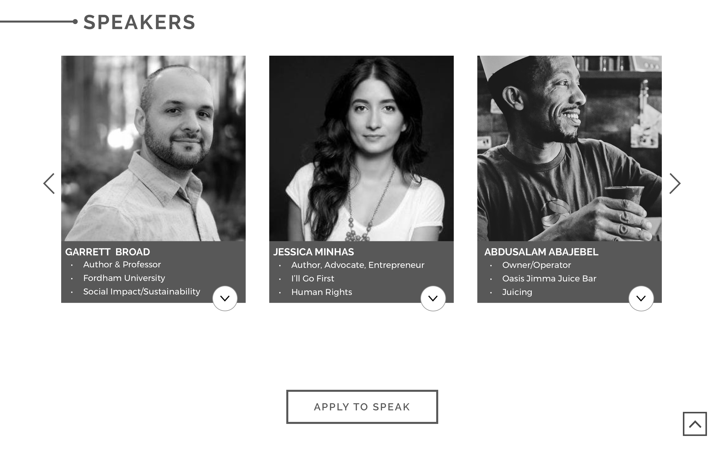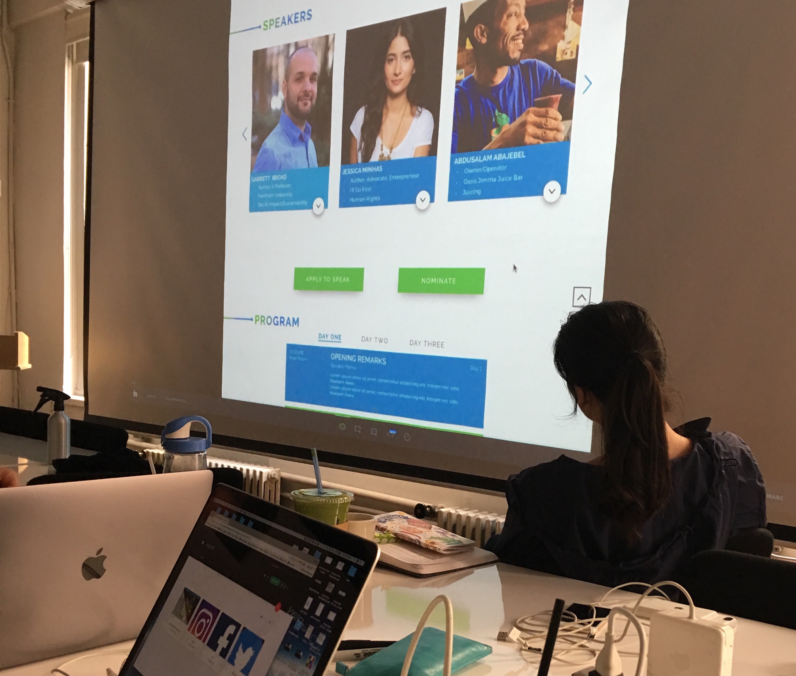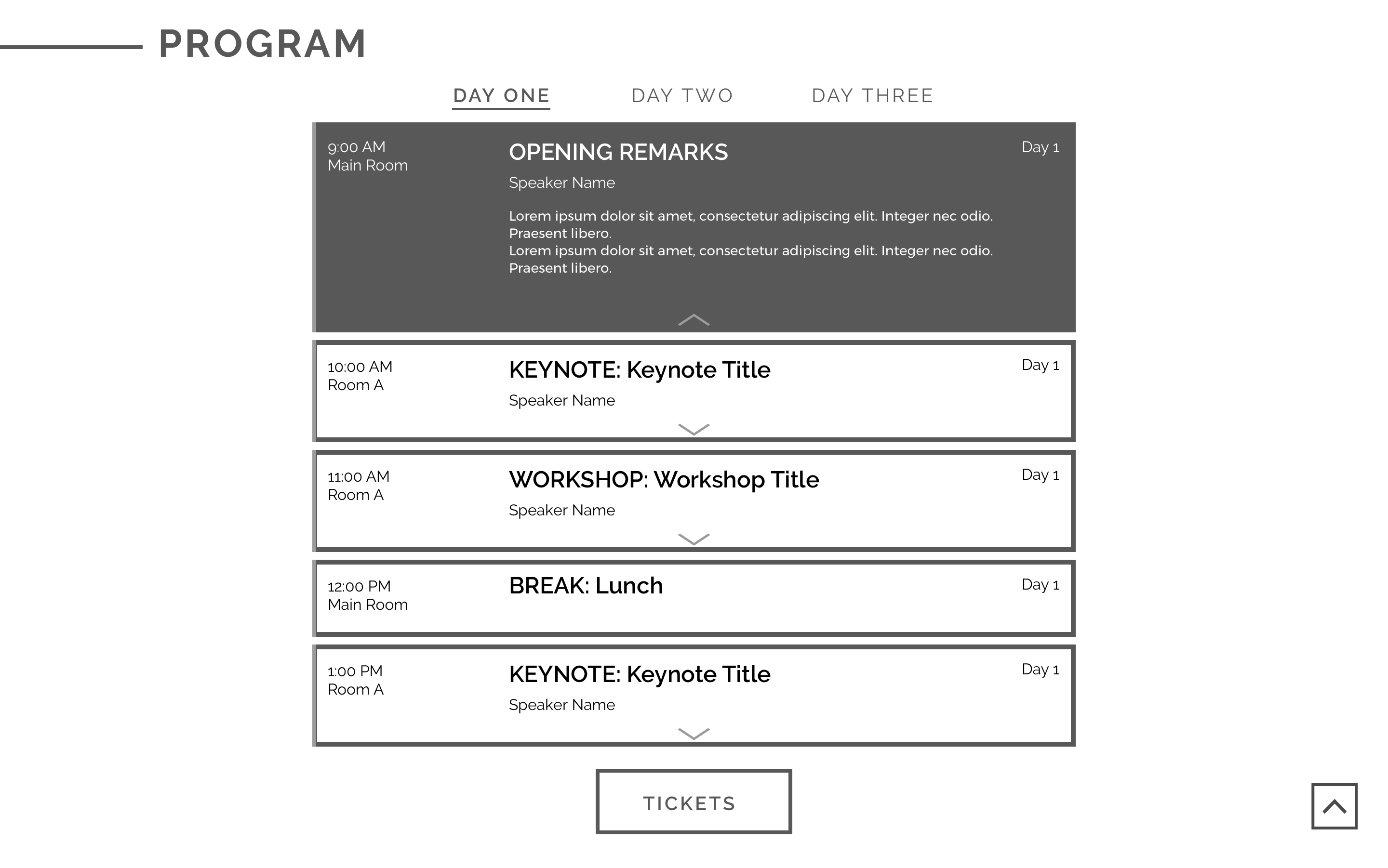 According to Nielsen Nelson Group, a continuous scroll is effective when content has a flat hierarchy. Based on the business needs (including sponsors on main page, highlighting location) and varying user needs (location, speakers, agenda, price), the many site sections all carried similar weight, warranting a flat hierarchy. Based on this, we also choose a sticky navbar to ensure the user had increased findability to all the sections.