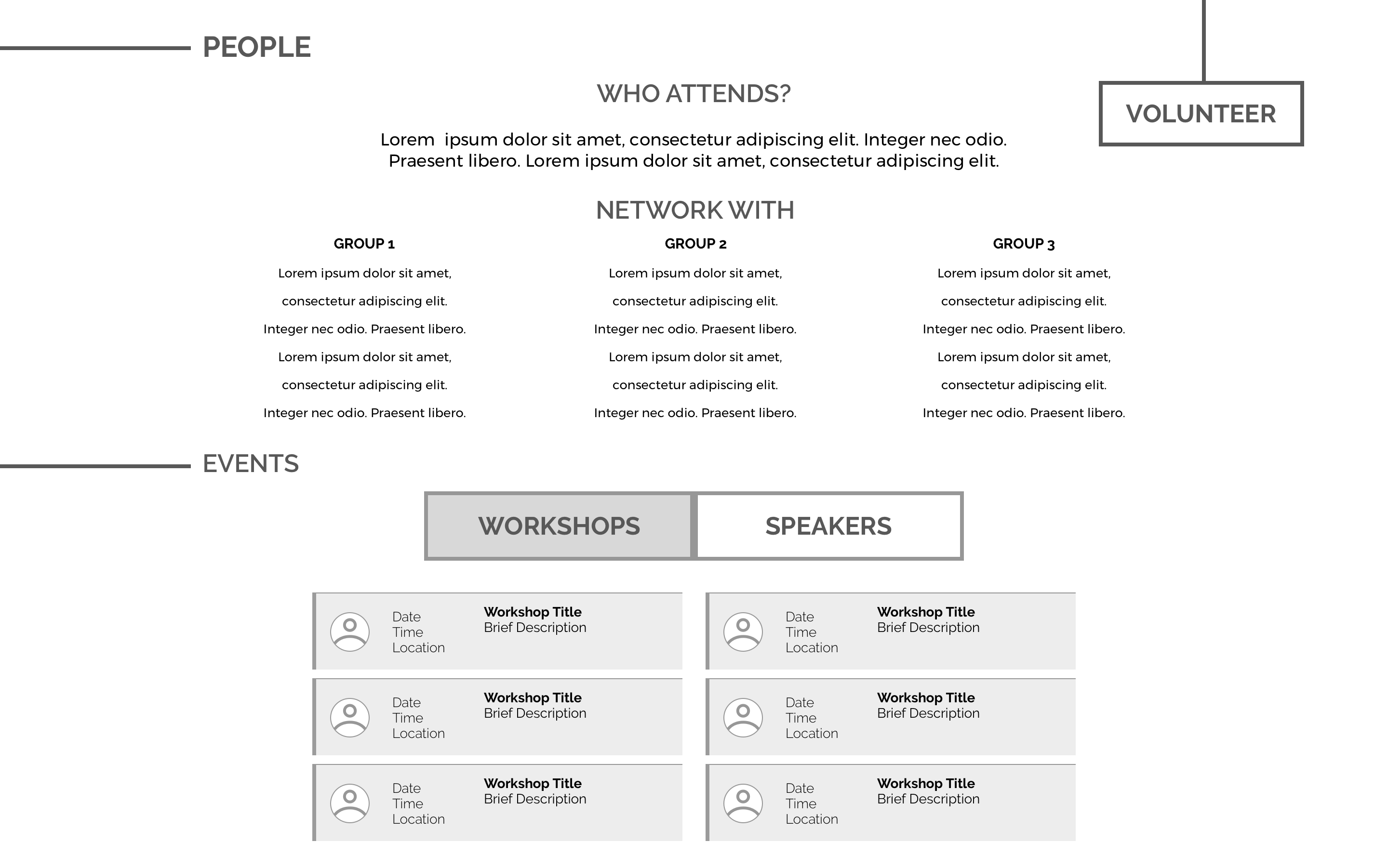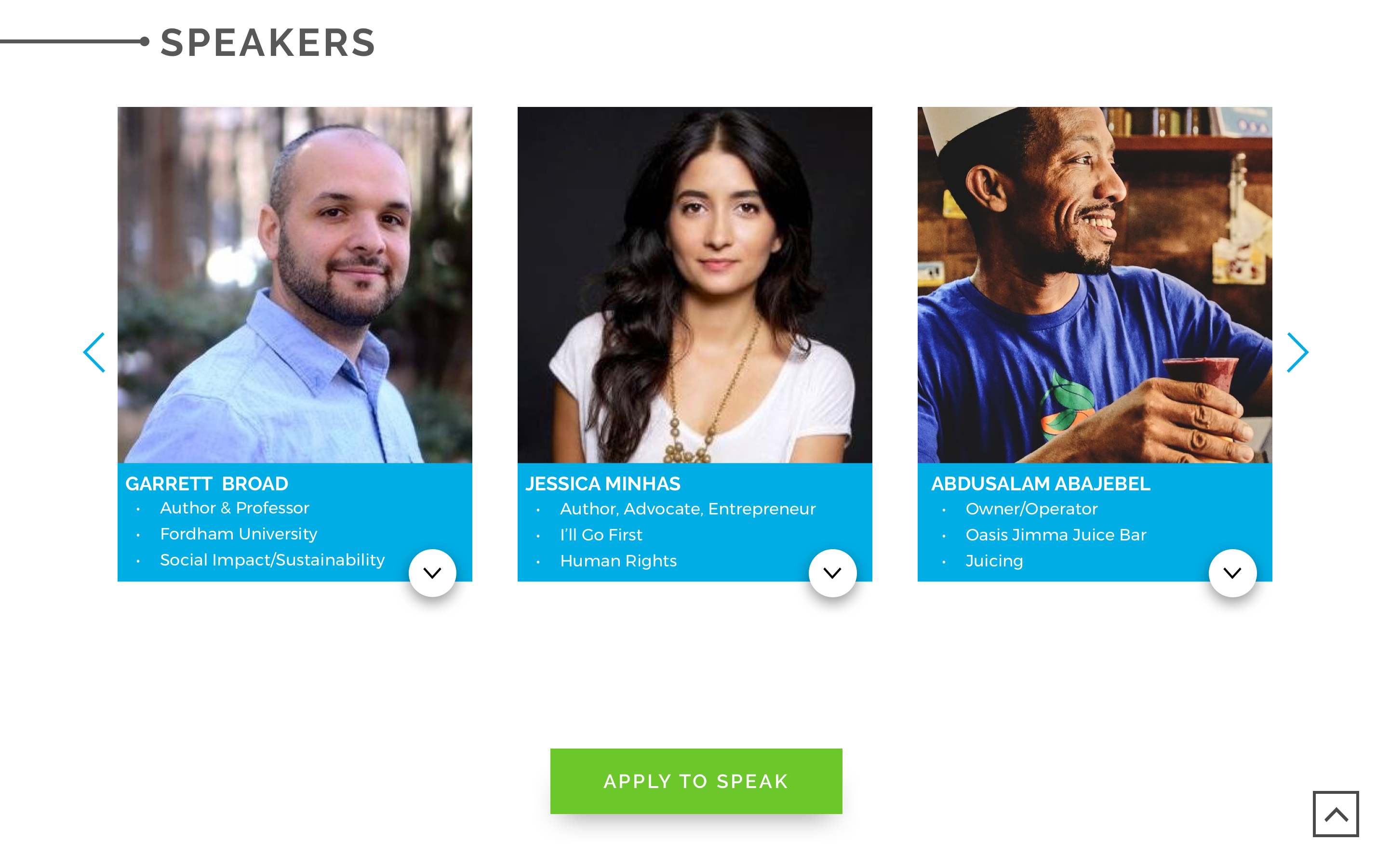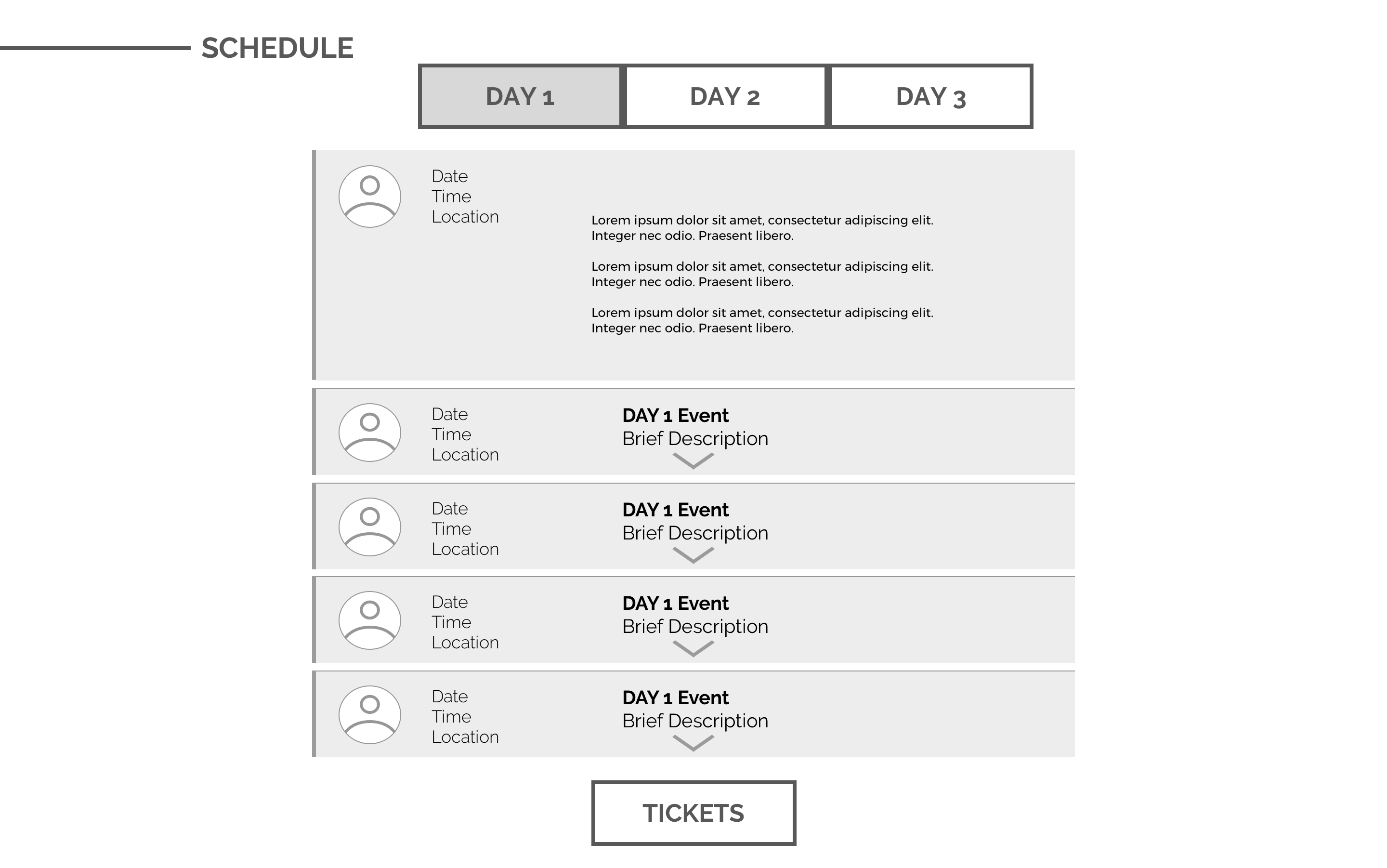 According to Nielsen Nelson Group, a continuous scroll is effective when content has a flat hierarchy. Based on the business needs (including sponsors on main page, highlighting location) and varying user needs (location, speakers, agenda, price), the many site sections all carried similar weight, warranting a flat hierarchy. Based on this, we also choose a sticky navbar to ensure the user had increased findability to all the sections.